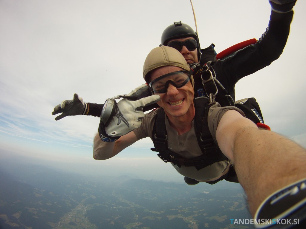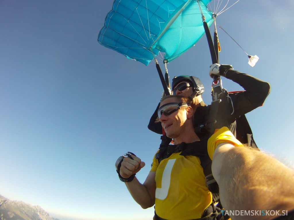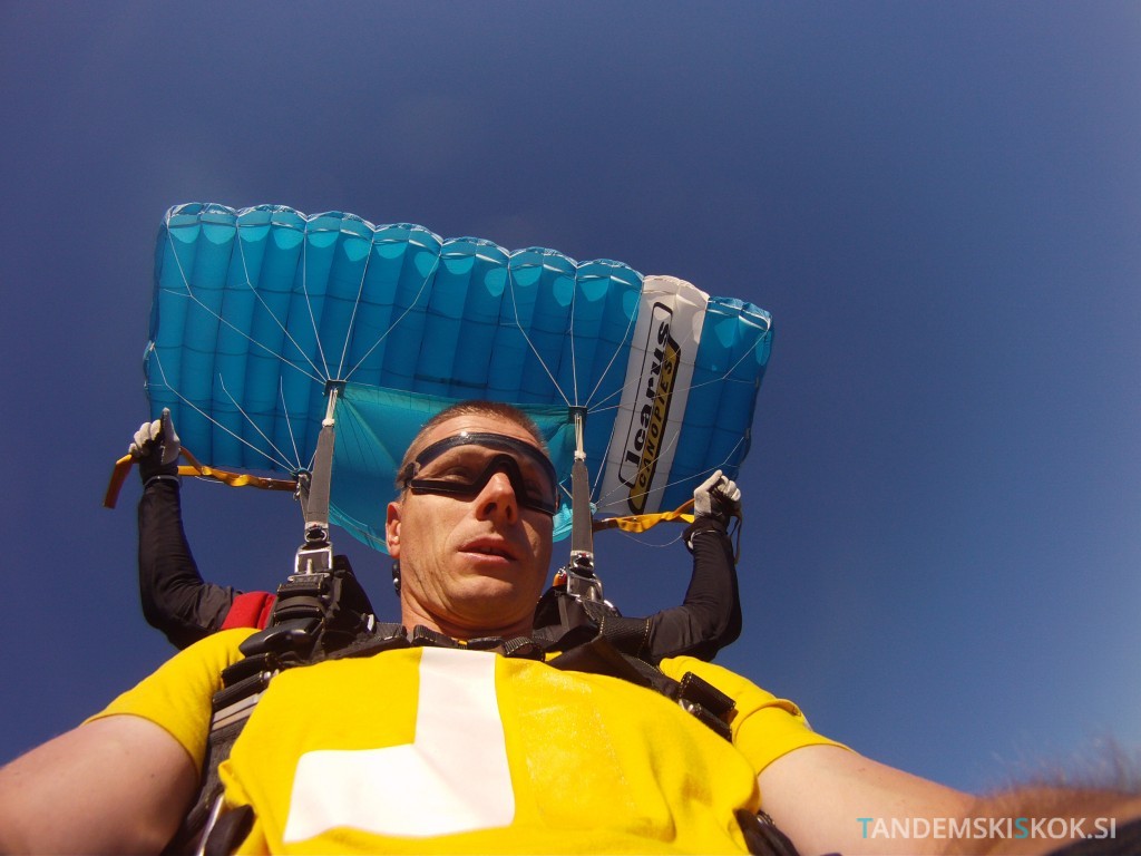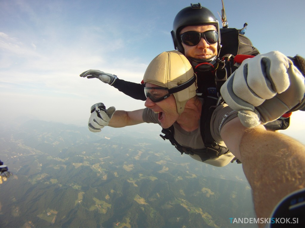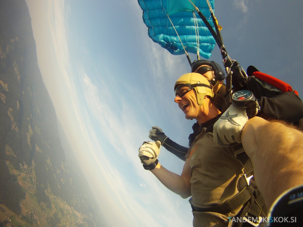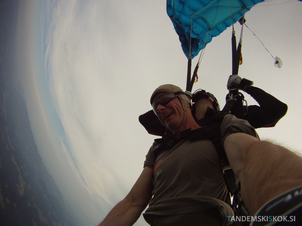 Vodja tandemskih inštruktorjev pri tandemskiskok.si Aljaž, se je med šolanjem novih tandem pilotov preizkusil tudi kot potnik.